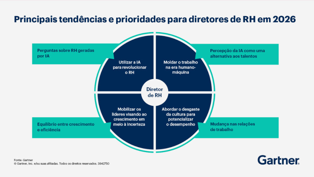 A Gartner Brasil organizou essas prioridades em quatro grandes frentes de atuação para os Diretores de RH (CHROs). Veja a representação visual do estudo: